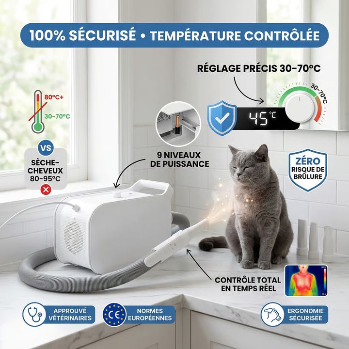 Contrôle précis de la température de 30°C (air frais, idéal pour l’été ou chats sensibles) à 70°C (séchage rapide en hiver). Vous adaptez la chaleur au confort de votre chat et à la saison. Contrairement aux sèche-cheveux classiques (80-90°C fixes), zéro risque de brûlure avec notre système intelligent.