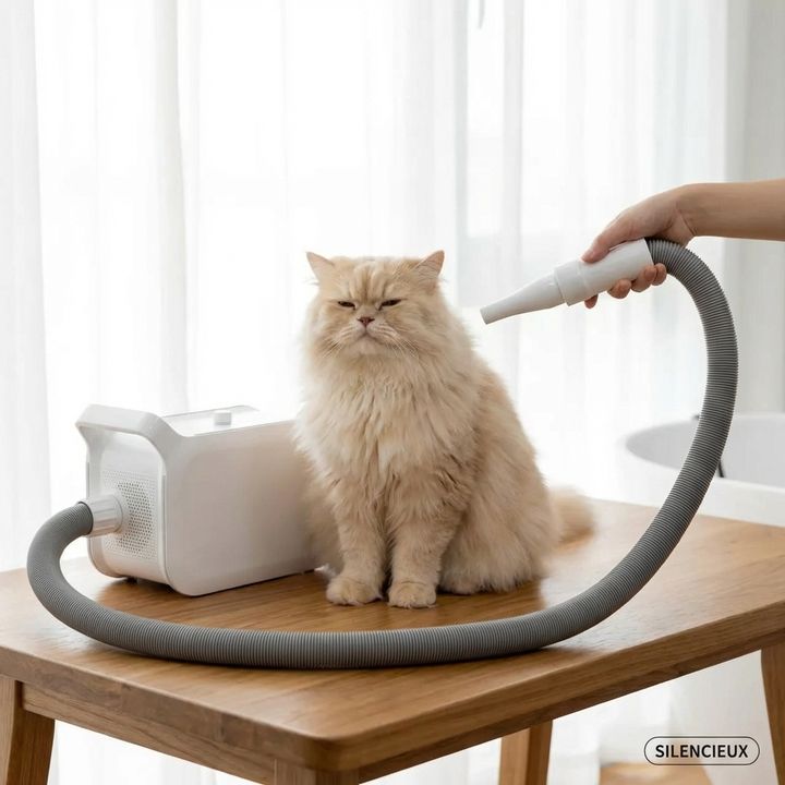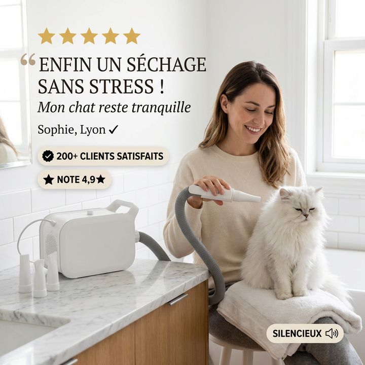 Niveau sonore entre 45 et 70dB selon la vitesse choisie, comparable à une conversation normale. Contrairement aux sèche-cheveux classiques (85-95dB), ce pulseur respecte l’ouïe ultra-sensible du chat et élimine le stress sonore du séchage.